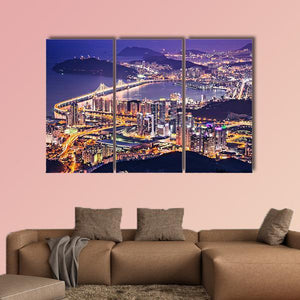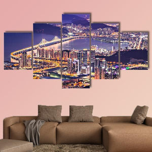 Busan City at Night presents a vibrant, energetic urban skyline seen from an aerial perspective, with a coastal bridge, ocean and distant mountains beneath a glowing night sky. Brightly lit buildings and streaks of car lights add color and motion; the modern, colorful scene fits well in contemporary homes and urban-inspired rooms.
