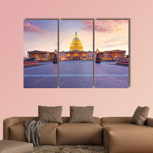 A wide, symmetrical cityscape of the U.S. Capitol Building at sunset featuring the dome, stone architecture and paved plaza. Soft yellows, pinks and purples meet glowing lights to create a majestic, serene mood. The print works well in modern living spaces like living rooms, home offices, or entryways.