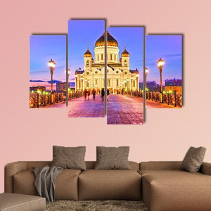 This realistic canvas depicts Christ Church in Moscow: a domed cathedral centered over an ornate bridge with glowing streetlights. Gold, white, blue and pink tones create a serene, illuminated twilight atmosphere. It works well in modern living rooms or entryways that favor cityscape art.
