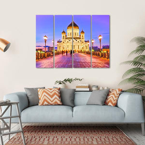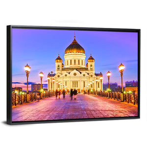 This canvas art captures the majestic Cathedral of Christ the Saviour in Moscow. With its illuminated dome and serene ambiance accented by glowing streetlights along a cobblestone path, it brings a peaceful vibe to any space.