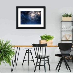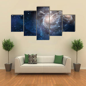 Clock & Space Canvas Wall Art depicts two swirling galaxies, glowing stars and a deep blue nebula rendered in blue, white, purple and gold tones. The modern, abstract composition uses depth and symmetry to create a cosmic, awe-inspiring sense of vastness. It suits modern home decor and contemporary rooms that favor astronomy or space-themed art.