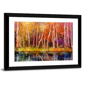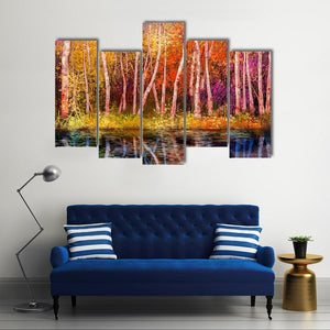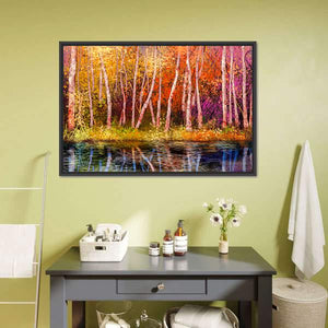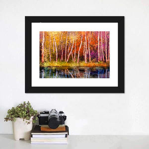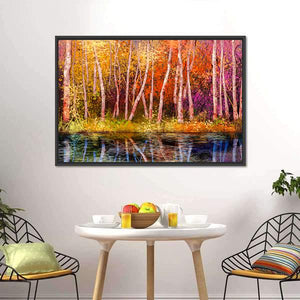 A modern, abstract landscape showing birch trees and their symmetrical reflection on a river, painted in autumnal oranges, yellows, greens, blues and purples. The scene feels vibrant yet serene and suits contemporary or nature-inspired rooms.