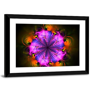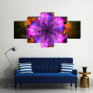 An abstract flower formed from purple, pink, orange, and green fractal patterns, with a symmetrical composition and swirling tendrils. The image reads as vibrant, energetic, and mesmerizing, and the modern canvas suits contemporary home decor and modern interiors.