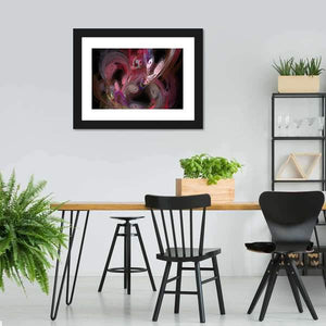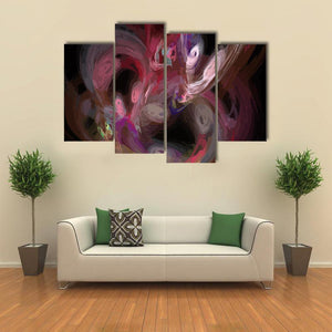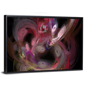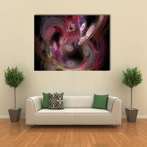 An abstract digital fractal canvas with swirling patterns and organic shapes set against a dark background. Layers of red, pink, purple, white and yellow form a dynamic, layered composition with a central focus and an energetic, chaotic, vibrant mood. It works well in modern rooms and contemporary wall decor.
