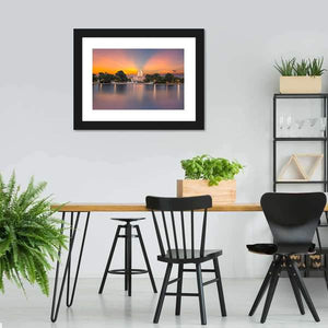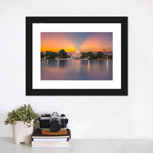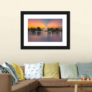 This canvas features the United States Capitol building at sunset, with the illuminated dome reflected on the water and framed by trees beneath a colorful sky. The photorealistic scene feels serene and majestic, with warm orange and pink tones against blues and greens. It suits modern home décor where a calm, colorful landscape can add visual interest.