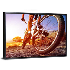 This vibrant canvas art captures the adventurous spirit of mountain biking against a stunning sunset backdrop. With dynamic colors of orange, brown, and purple, it evokes an epic atmosphere that brings energy to any space.