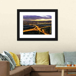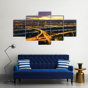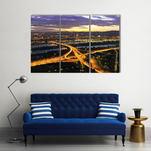 This vibrant cityscape captures the dynamic skyline of Vienna at dusk, featuring the Danube River and glowing city lights. Perfect for adding a modern touch to your home decor.