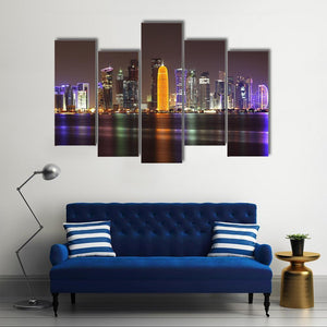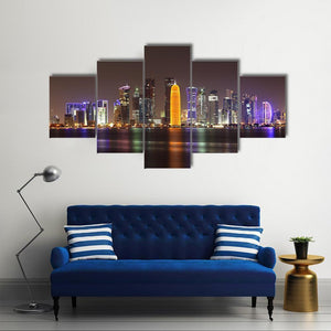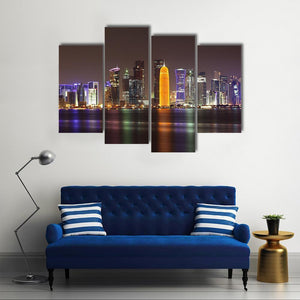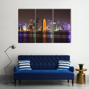 This vibrant canvas art captures the stunning Doha skyline, showcasing tall skyscrapers against a colorful night sky. The glowing lights and shimmering water reflections create a modern, nocturnal atmosphere, making it a striking addition to any space.