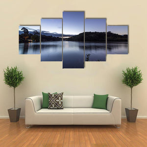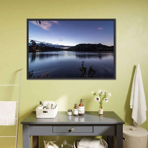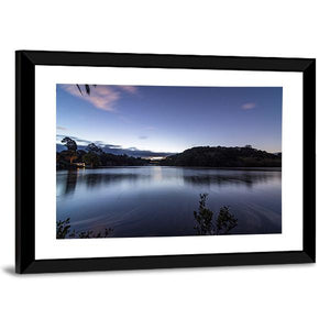 Dusk At Haruru Campsite depicts a lake framed by trees beneath a dusky, cloud-filled sky, with long-exposure water ripples that lend a tranquil, atmospheric mood. The rule-of-thirds composition and blue-green-purple palette suit modern house interiors and calm room decor.