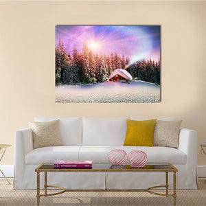 A snowy cabin tucked in a pine forest beneath a nebula-lit, starry night — a peaceful, magical winter scene. Soft purples, pinks, whites and a warm window glow create depth and rule-of-thirds balance, making this canvas a calm focal piece for modern or nature-inspired interiors.