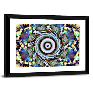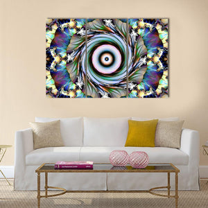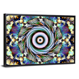 Floral Design Canvas Wall Art blends floral motifs with an abstract, symmetrical vortex of swirling patterns and geometric shapes in blue, green, purple, white, and black. The result is mesmerizing, vibrant, and complex — a modern piece that suits contemporary home and room decor.