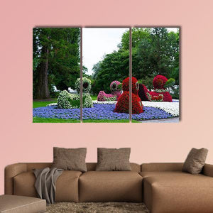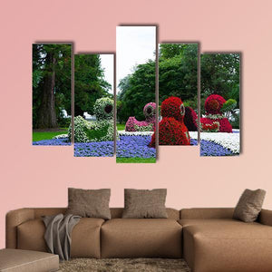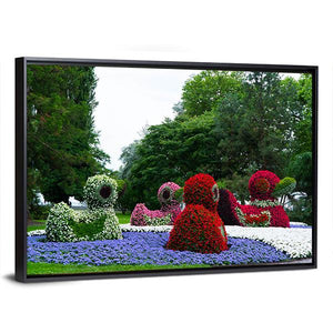 Floral Figures of Ducks Canvas Wall Art features duck-shaped topiaries among dense flower beds, rendered in a realistic style. The vibrant, playful palette of greens, reds, purples, whites and browns creates a whimsical, garden-like atmosphere that suits nature-inspired or modern interiors.