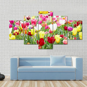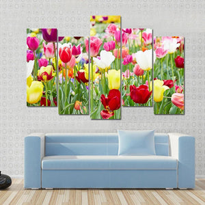 Bring the beauty of spring indoors with this vibrant canvas featuring a close-up view of blooming tulips. The lively colors create a cheerful atmosphere, making it a delightful addition to any decor.