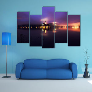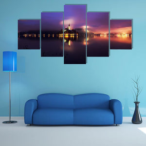 This captivating landscape features a mysterious island church beside a serene lake, enveloped in a foggy atmosphere. With a palette of purple and dark blue tones, it brings an enchanting vibe to any space.