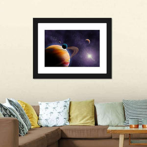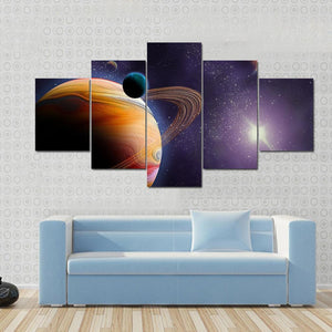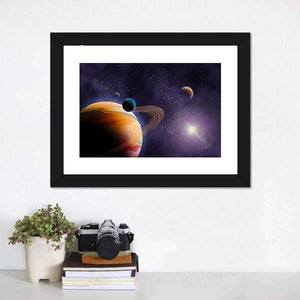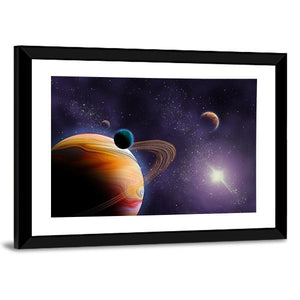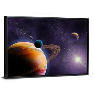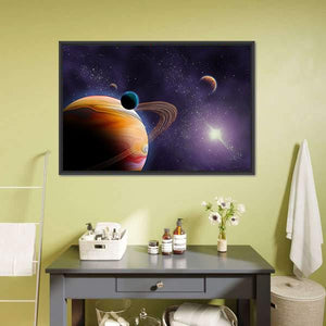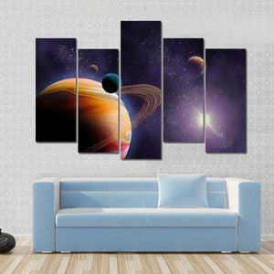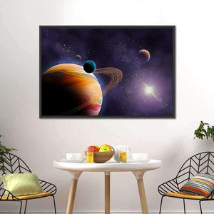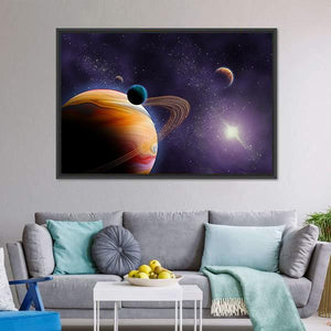 This canvas art features captivating planets against a dark cosmic backdrop, infused with vibrant colors like purple, orange, and blue. Its abstract style evokes a sense of mystery and grandeur, perfect for adding a striking focal point to any modern space.