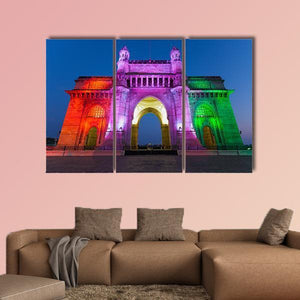 Gateway of India Canvas Wall Art shows the landmark’s archway from a low-angle perspective, illuminated in orange, pink, purple, green and blue. The image reads as a festive, vibrant cityscape beneath a clear blue night sky and fits modern home decor like living rooms or entryways.
