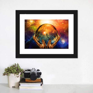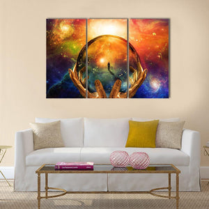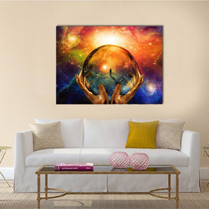 Man In Sphere Glass Canvas shows a silhouetted person walking toward a glowing crystal ball held by hands, with a miniature city visible inside the sphere. A symmetrical, surreal composition mixes blues, oranges, yellows, purples and gold to create a mystical, awe-inspiring cosmic mood that suits modern, science- or fantasy-inspired rooms.