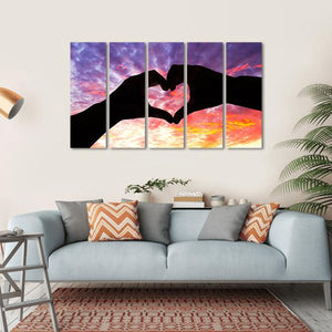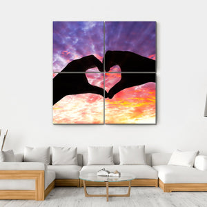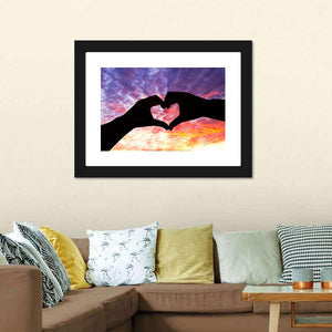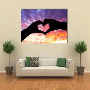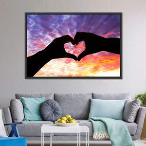 Capture the essence of love with this striking silhouette of hands forming a heart against a cloudy sunset sky. The rich palette of black, purple, orange, and yellow creates a romantic and peaceful atmosphere, perfect for any cozy space.