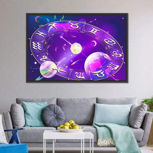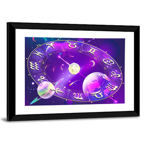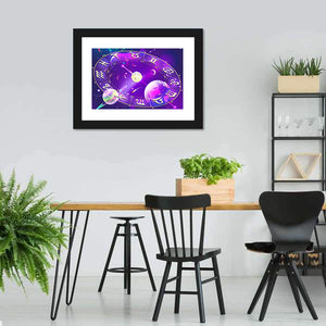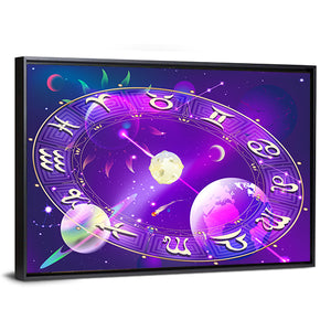 This captivating canvas artwork showcases a beautifully rendered zodiac wheel surrounded by planets and stars. With its mystical palette of purple, gold, pink, and blue, it creates an ethereal atmosphere that will enchant any space.