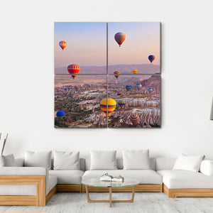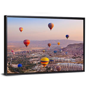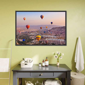 This captivating canvas artwork features colorful hot air balloons soaring over unique rock formations and majestic mountains. The dreamy palette of pinks, oranges, and blues evokes a peaceful and adventurous atmosphere, ideal for bringing a touch of nature into your space.
