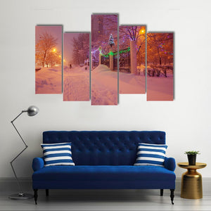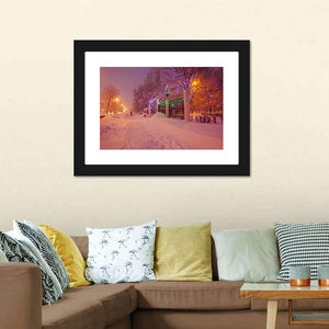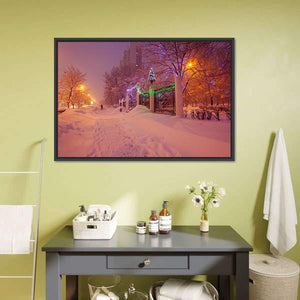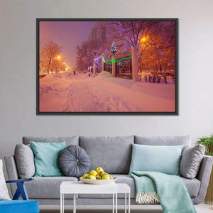 This captivating canvas features a snowy path illuminated by charming street lights and decorated trees. With a magical and quiet wintery vibe, it brings a touch of serenity to any space.