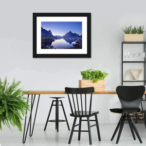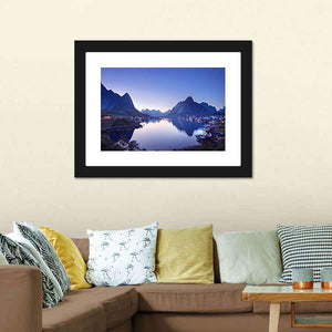Reine Village, Norway rendered as a photorealistic landscape with snow-capped mountains, calm water, and a quiet village reflected in the lake. Soft blues and purples with glowing village lights create a calm, serene mood that fits modern living rooms or bedrooms.