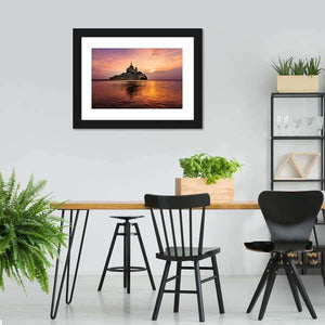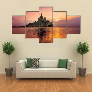 Mont Saint Michel Canvas Wall Art depicts the island monastery at sunset, with a castle-like structure and its reflection on calm ocean waters. The photorealistic landscape leans on purple, orange, pink and blue tones for a serene, majestic mood that works well with modern home decor such as living rooms and entryways.