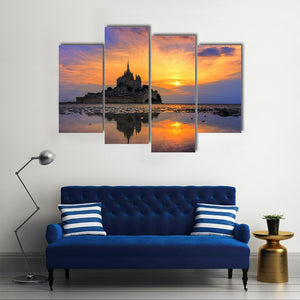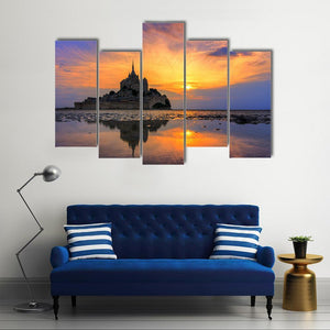 Le Mont Saint Michel in Normandy is captured in photorealistic detail — a castle and monastery on an island at sunset, shown in warm orange and cool blue tones. Striking cloud formations and a mirror-like water reflection create a dramatic, serene, majestic scene that suits modern living rooms or entryways.