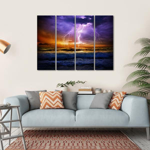 This powerful canvas art captures a dramatic storm over the ocean, with multiple lightning strikes illuminating dark clouds and the surging sea. The intense palette of purple, orange, and blue evokes a sense of awe, making it an engaging focal point for your wall decor.