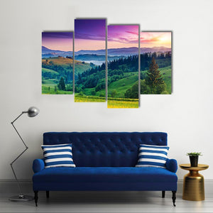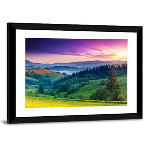 Majestic Carpathian Sunset captures rolling hills, trees, fields and distant mountains beneath a dramatic sunset sky, with fog resting in the valleys. Rendered in a realistic, colorful palette of green, yellow, purple, blue and pink, it creates a serene yet vibrant mood that fits modern home decor.