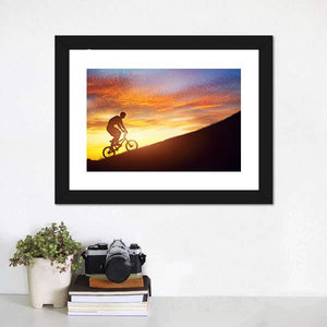 A silhouetted cyclist rides a BMX bike uphill at sunset, rendered in bold orange, yellow, purple and black tones. Composed with the rule of thirds for a dynamic, aspirational feel, this print fits modern living rooms, bedrooms or home offices that favor motivational wall decor.