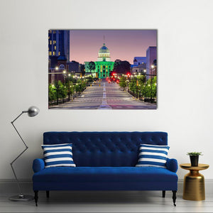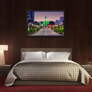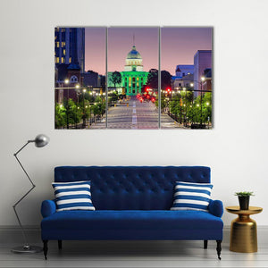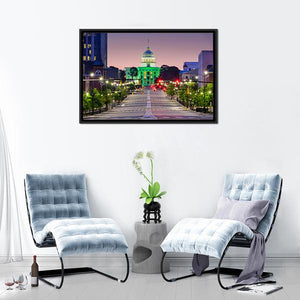 This vibrant canvas art captures the Alabama State Capitol, presenting its striking architecture against a twilight urban backdrop. The illuminated dome and streetlights evoke a lively city atmosphere, making it a captivating addition to your wall decor.