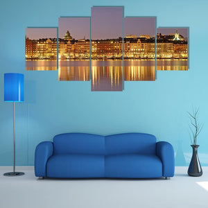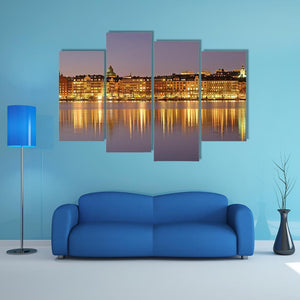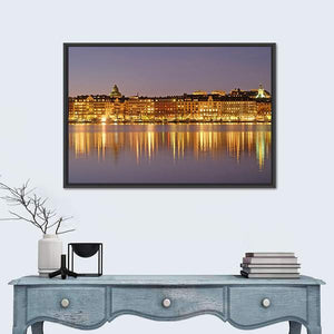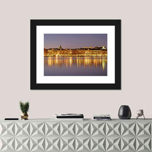This captivating cityscape features waterfront buildings and a vibrant skyline under the serene night sky. The artwork beautifully captures reflections of night lights in warm yellows and deep blues, creating a sophisticated atmosphere.