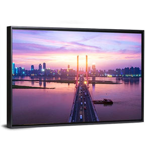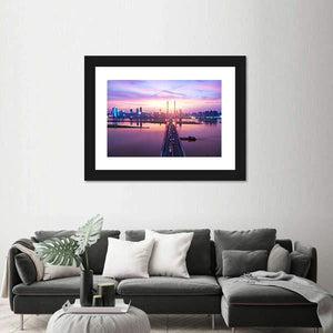 This canvas art features a stunning bridge set against a vibrant sunset. With a tranquil blue river and distant city skyline, it captures a majestic moment in time. Perfect for adding a modern touch to any space.