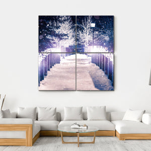This enchanting canvas art captures a snowy path lined with glowing string lights and trees under a serene winter night. The magical scene evokes the festive spirit while adding a touch of beauty to your home decor.