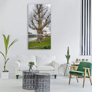 A centered riverside scene in Koblenz, Germany with a large bare-branched tree, grassy bank, low-lying flowers and distant buildings. The muted brown, green, gray and purple palette creates a calm, serene, natural mood captured in a nature photography style that suits modern or nature-inspired rooms.