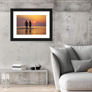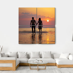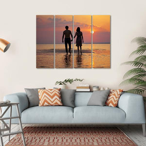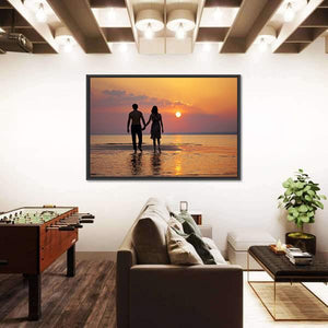 Celebrate love with this enchanting canvas capturing a couple silhouetted against a serene beach sunset. The warm hues of orange and pink reflect a peaceful atmosphere, making it a beautiful addition to your wall decor.