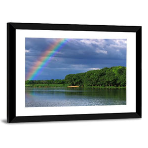 A vibrant rainbow arches over a lake beside a dense green forest under a dark, stormy sky, giving the scene a dramatic yet serene and hopeful mood. The piece is rendered in a realistic style with blues, greens, grays, and touches of yellow and red—suitable for modern rooms or nature-themed spaces.