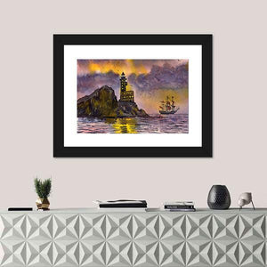 This captivating artwork features a tall lighthouse on a rocky outcrop, accompanied by a sailing ship navigating through a stormy ocean. The dramatic clouds illuminated by bright yellow light create a moody atmosphere, making this piece a striking addition to your wall decor.