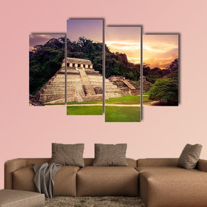 A realistic landscape of the Ruins of Palenque in Mexico, showing a Mayan pyramid rising from dense jungle at sunset. Warm golds and oranges meet greens and browns beneath a dramatic, purple-tinged sky for a serene, majestic, ancient mood that suits modern living rooms or a study.