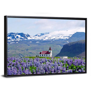 This beautiful canvas art features a serene scene of a red-roofed white church surrounded by purple lupine flowers and majestic mountains. The picturesque landscape invites tranquility and adds a touch of natural beauty to any space.