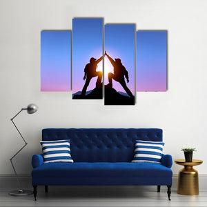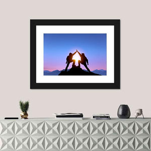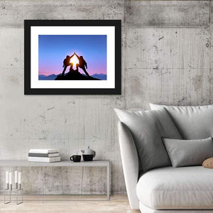 Two silhouetted figures high-fiving on a mountaintop stand against a sunburst at sunset, rendered in blues, purples, yellows and black. This minimalist, modern landscape carries a triumphant, adventurous and serene mood and works well in modern homes and room decor.