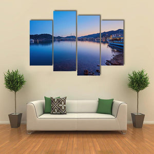 Small Port Of Kekova shows a tranquil coastal harbor at dusk, with boats on calm water that reflects blue, orange and purple skies, a rocky shore in the foreground, and distant coastline lights. Rendered in a photorealistic style with layered depth and a rule-of-thirds composition, it fits modern or nature-inspired rooms seeking a peaceful, atmospheric focal piece.