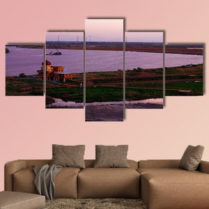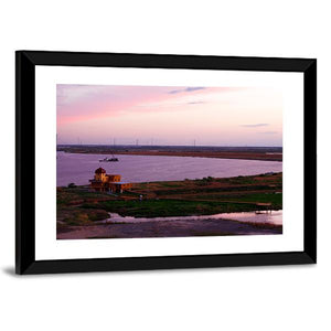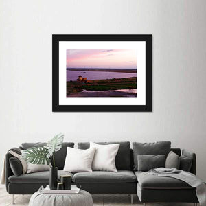 A river-side shipbuilding scene at sunset, centered on a domed building with ships and grassland under purple and pink clouds. The rule-of-thirds composition and a palette of purple, pink, green and brown create a serene, peaceful atmosphere that fits modern or nature-themed rooms.
