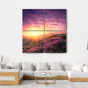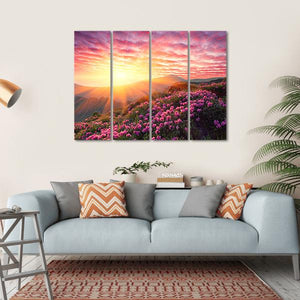 Experience the serene beauty of a mountain landscape adorned with vibrant pink flowers under a colorful sunrise. This captivating canvas art highlights the sun rays piercing through the clouds, creating a hopeful and majestic atmosphere.