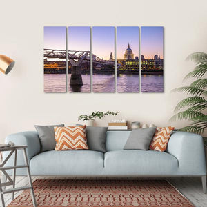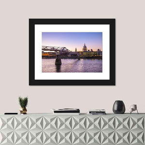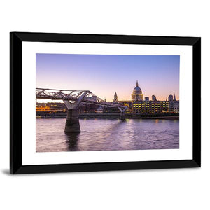 This canvas wall art captures the majestic St. Paul’s Cathedral alongside the Millennium Bridge in London. The tranquil twilight scene, painted in shades of purple, blue, and gold, evokes a serene atmosphere, making it a stunning addition to any space.