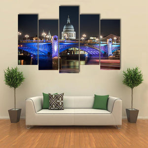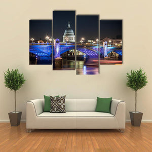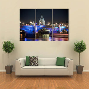 St Paul's Cathedral in London appears against a lively night skyline, with the dome and a nearby bridge set over the river. Rendered in blues, purples, white and black with blurred boat lights and a rule-of-thirds composition, this modern cityscape suits modern living rooms and urban interiors.
