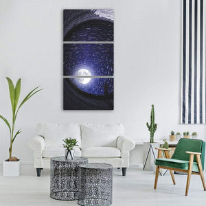 A moon sits at the center of a worm's-eye, tunnel-like sky as elongated star trails spiral into a vortex around a silhouetted figure with arms raised, creating a mysterious, awe-inspiring, surreal night scene. The abstract, modern composition works well in contemporary living rooms or bedrooms as a focal piece for modern décor.