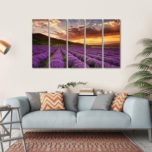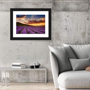 This canvas wall art captures the serene beauty of a lavender field at sunrise, framed by distant mountains and a dramatic sky. The sunbeams breaking through the clouds create a breathtaking atmosphere, inviting you to embrace nature's tranquil moments.
