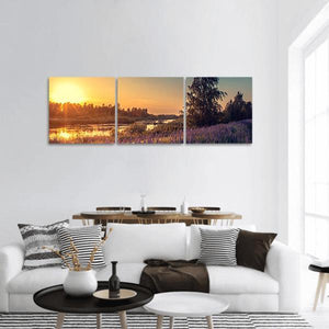Lupines At Sunset depicts a field of lupine flowers by a river and trees beneath a warm summer sunset. The panoramic scene blends orange, yellow and purple tones with a soft lens flare and water reflection to create a serene, tranquil mood. It works well in modern or nature-inspired rooms that favor calm, warm color.